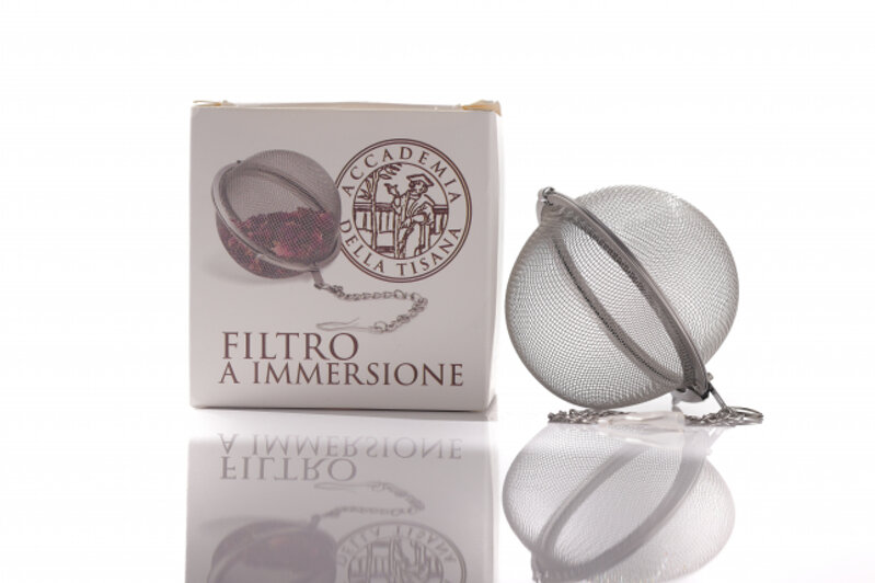 Filtro a immersione di forma sferica con catenella. Le dimensioni della sfera permettono alla tisana all'interno di entrare interamente a contatto con l'acqua. In questo modo, l'infusione è totale e funzionale a una buona preparazione dell'infuso.